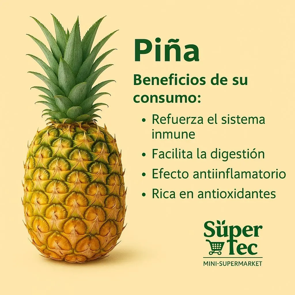🍍 Piña fresca Súper TecPiña jugosa, dulce y de excelente calidad, seleccionada para ofrecerte frescura y sabor natural. Ideal para jugos, postres o para disfrutarla sola. Una fruta refrescante, nutritiva y a precio accesible, perfecta para tu día a día.